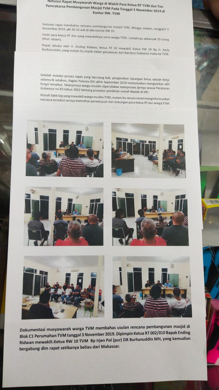 Apakah warga nonmuslim terima kesepakatan itu? “ Terima dong. Buktinya, hanya selang seminggu setelah rapat, wakil mereka Hendro Hananto membuat sudah mengirim surat kepada Ketua RW (15 November 2019) untuk menindaklanjuti hasil rapat. Mereka juga melayangkan surat yang ditandatangani bersama Ketua RW Burhanuddin Andi pada tanggal 24 November 2019 untuk Pengembang TVM. Surat itu menanyakan status tanah yang diusulkan untuk jadi lokasi mesjid, “ cerita Yandi.