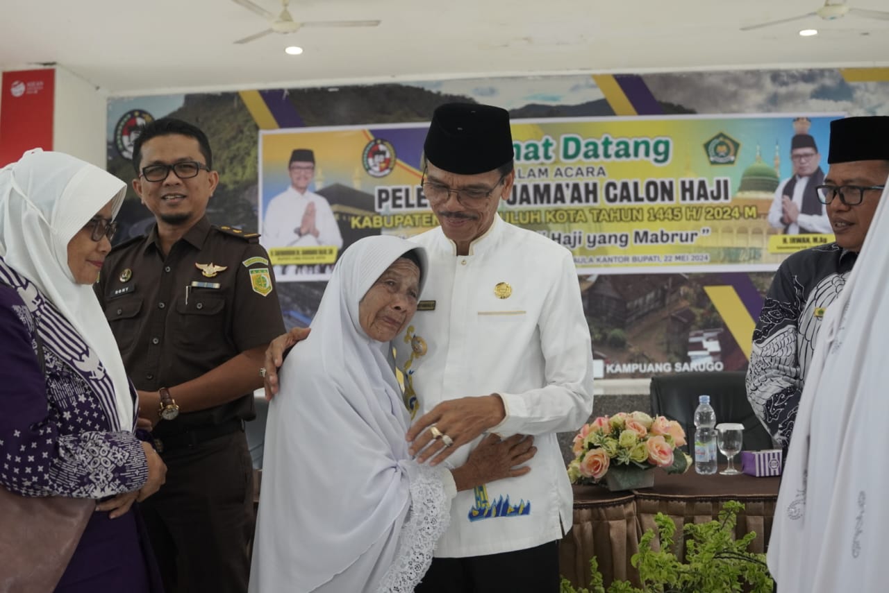SEMANGATNEWS. COM — Labbaik Allahumma, Labbaik. Labaika Laa Syarika Laka Labbaik. Suasana bahagia dan haru terpancar dari wajah 322 Calon Jemaah (Calhaj) asal Kabupaten Limapuluh Kota kelompok terbang (kloter) XIV dan XVII, Embarkasi Padang, Sumatera Barat. Diiringi lantunan Talbiyah, Calhaj Limapuluh Kota tahun 2024/1445 Hijriyah dilepas secara resmi oleh Bupati Limapuluh Kota Safarudddin Dt.Bandaro Rajo di Aula Kantor Bupati Limapuluh Kota, Sarilamak, Rabu, (22/05/2024). Pelepasan Calhaj yang dijadwalkan terbang menuju Jedah Arab Saudi pada Selasa (27/05/2024) dan Kamis (30/05/2024) dari Bandara Internasional Minangkabau Padang Pariaman itu berlangsung khidmat. Acara pelepasan dihadiri oleh Kepala Kantor Kemenag Limapuluh Kota Irwan, unsur Forkopimda, Ketua MUI Limapuluh Kota Asrat Chan, Plt.Asisten I Eki Hari Purnama serta sejumlah Kepala Perangkat Daerah di Lingkungan Pemerintah Kabupaten Limapuluh Kota.