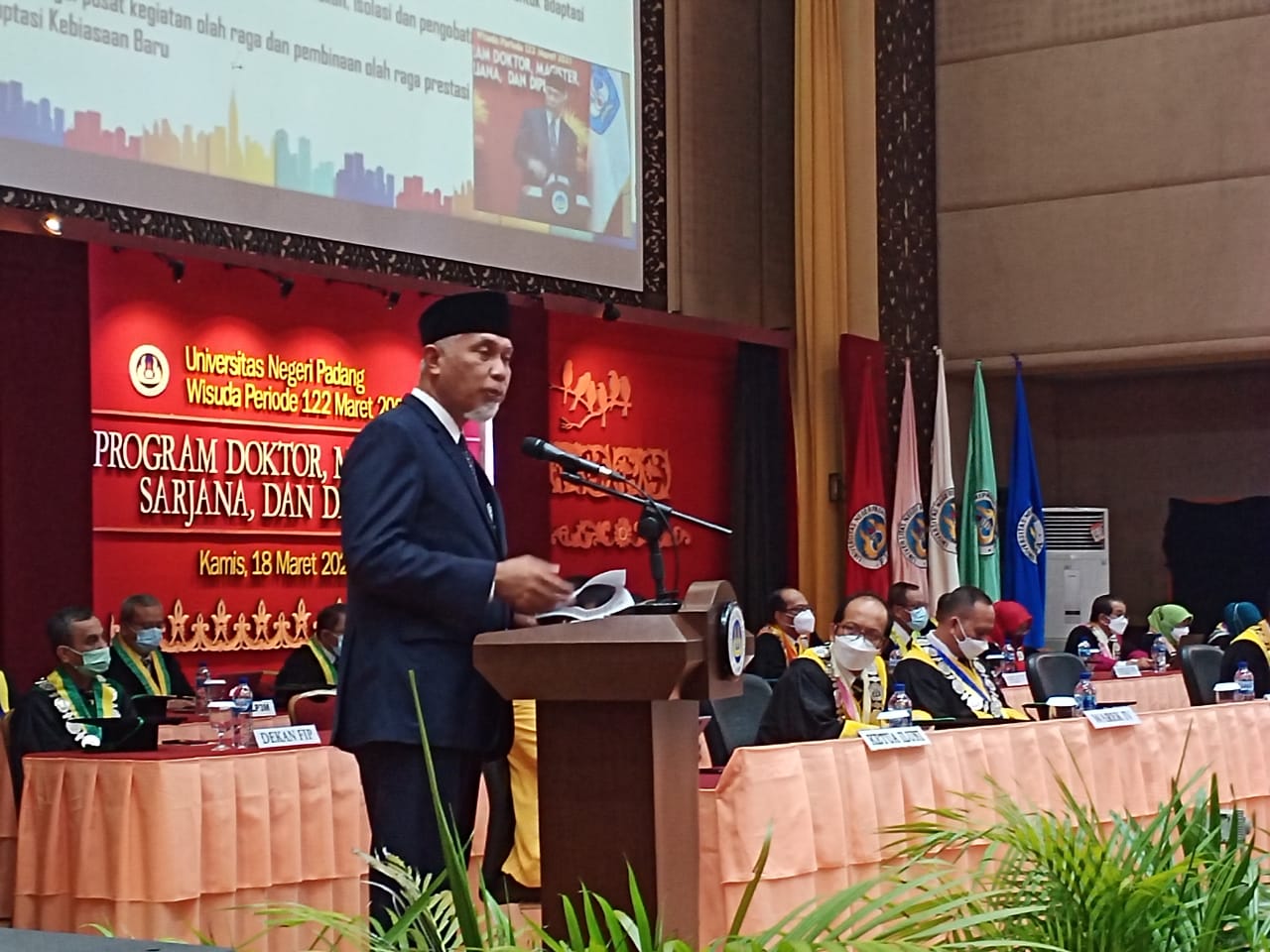 SEMANGATNEWS.COM – Universitas Negeri Padang (UNP) menggelar prosesi Wisuda periode ke-122 secara luar jaringan (luring) dan dalam jaringan (daring) selama tiga hari berturut – turut, 18-20 Maret 2021. Prosesi digelar di Auditorium UNP, Kampus Air Tawar, Kota Padang, Kamis (18/3/2021).