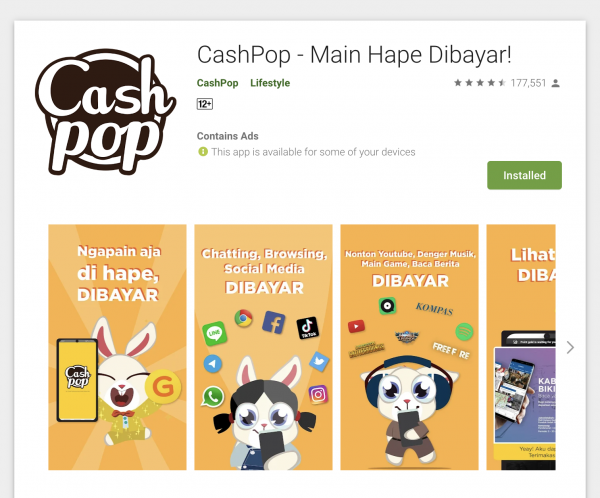 Aplikasi CashPop sendiri hadir pada 7 Maret 2017 dan telah didownload lebih dari 1 juta orang. CashPop merupakan sebuah aplikasi penghasil uang yang bisa digunakan untuk menghasilkan uang, pulsa, paket internet, voucher gratis, voucher game, voucher makan, voucher belanja, sembako, PLN, tiket, berlangganan serta voucher perawatan dan kecantikan.