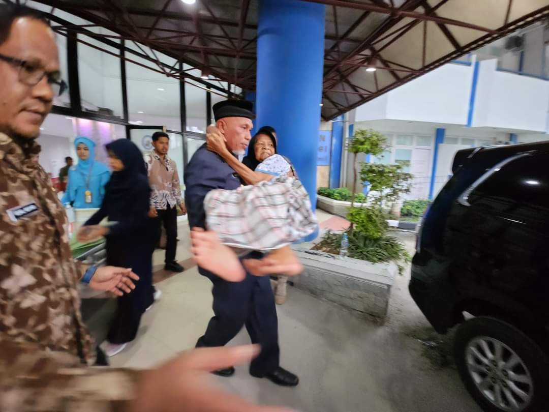 Adalah Nurmi (81), ibunda dari Gubernur Sumbar, Mahyeldi Ansharullah, akhirnya dibolehkan pulang, Kamis (16/11/2023). Tampak Gubernur menggendong sendiri sang ibunda ke dalam mobil, saat menjemput dan dibawa pulang ke Gubernuran.