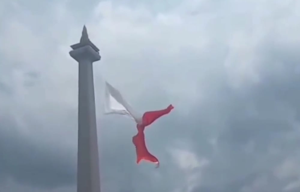 Video berdurasi singkat itu kemudian viral di media sosial, menunjukkan bendera besar yang dikibarkan tiba-tiba terkoyak pada bagian merah, dan potongan kainnya tampak berkibar di udara sebelum bagian bendera merosot ke sisi tiang.