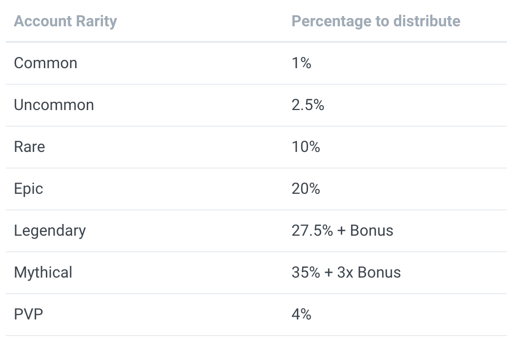 Akun pemain akan dibagi menjadi 2 jenis yang berbeda, akun virtual (umum dan tidak umum), dan akun NFT (langka, epik, legendaris, dan mitos)