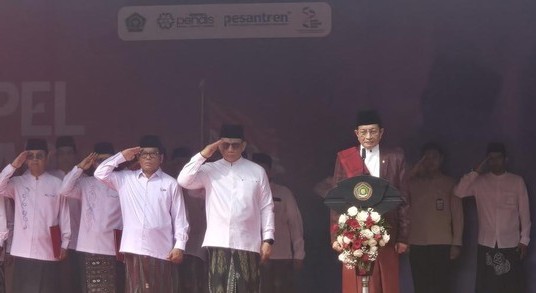 Apel di Kemenag juga dihadiri oleh unsur pimpinan, pegawai dan santri dari berbagai unit di lingkungan kementerian. Suasana khidmat terlihat saat bendera merah-putih dikibarkan dan seluruh peserta menyanyikan lagu kebangsaan hingga mars santri dengan penuh semangat.