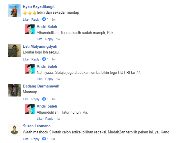 “Sebagai praktisi di bidang Kehumasan, saya tentu menyambut baik peluncuran logo ini. Lumayan lah untuk nambah-nambah bahan konten media sosial di kantor. Namun, saya cukup terkedjoet melihat penampakan logo HUT RI ke-76 ini. Agak aneh, absurd, dan nggak biasa. Kening saya yang sudah berkerut karena usia, jadi tambah berkerut lagi berlipat-lipat. Nggak salah, nih, logonya? Takut salah download logo, tapi kayaknya, sih, nggak”, ujarnya.