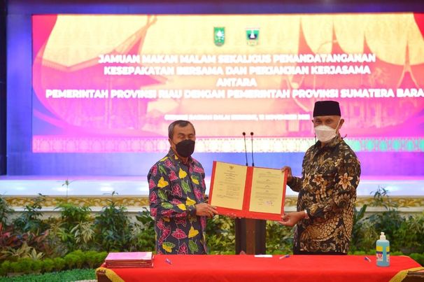 Penandatanganan kesepakatan bersama dan perjanjian kerjasama antara pemerintah Provinsi Riau dan Sumbar digelar di Gedung Daerah Balai Serindit, di Kediaman Gubernur Riau, Jumat (12/11/2021).