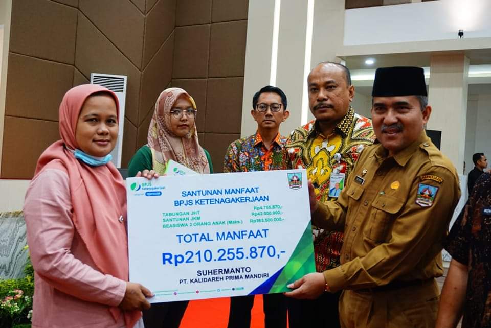 Dalam sambutannya sebelum penyerahan santunan, Sekda menjelaskan jaminan sosial ketenagakerjaaan memberikan perlindungan dan manfaat bagi pekerja atau buruh sedang dan atau setelah melaksanakan pekerjaan.