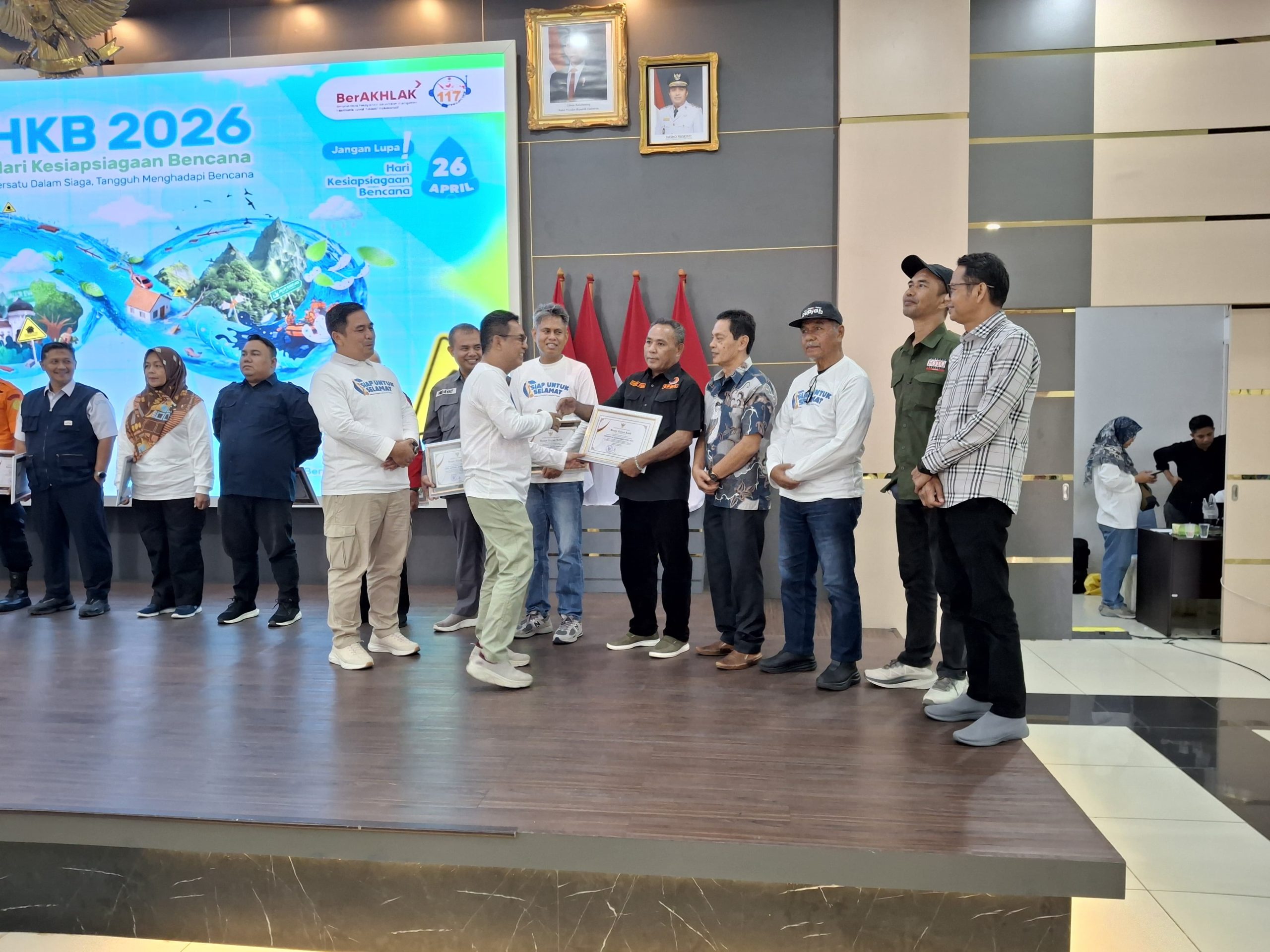 SEMANGATNEWS.COM. Serikat Media Siber Indonesia -SMSI Sumatera Barat bersama organisasi media dan wartawan di Sumbar, khususnya konstituen Dewan Pers, mendapat Piagam Penghargaan Kebencanaan dari Badan Penanggulangan Bencana Daerah (BPBD) Pemprov Sumbar yang diserahkan Gubernur dalam Hari Kesiapsiagaan Bencana (HKB), Minggu (26/4/2026) di Auditorium Istana Gubernur Sumbar, Padang.