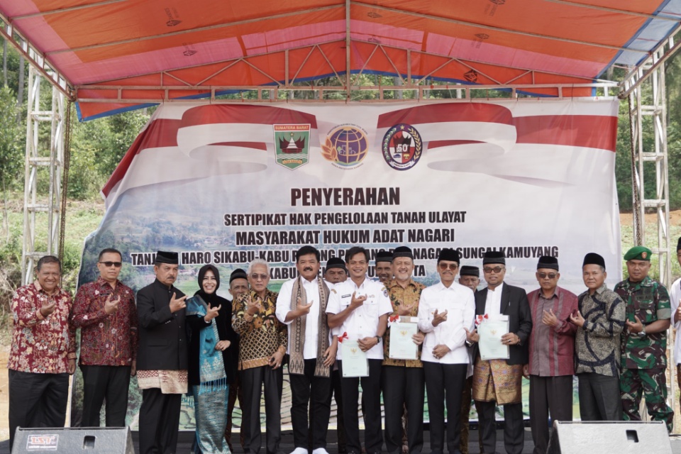 SEMANGATNEWS.COM — Untuk pertama kali di Indonesia, Nagari Tanjung Haro Sikabu-Kabu Padang Panjang (Sitapa) dan Nagari Sungai Kamuyang Kecamatan Luak bersama Nagari Sungayang, Kabupaten Tanah Datar menerima sertifikat Hak Pengelolaan (HPL) Tanah Ulayat dari Kementerian Agraria dan Tata Ruang/Badan Pertanahan Republik Indonesia. Perdana sejak Undang-undang Pokok Agraria tahun 1960 dilahirkan, tanah ulayat secara sah mendapatkan kepastian hukum melalui Sertifikat Hak Pengelolaan. Istimewanya, Sertifikat HPL tersebut secara langsung diserahkan oleh Menteri Agraria dan Tata Ruang/Badan Pertanahan Nasional (ATR/BPN) Marsekal TNI (Purn) Hadi Tjahjanto, dalam kunjungan kerjanya ke Limapuluh Kota dan Tanah Datar, Selasa-Rabu, (10-11/10/2023).
