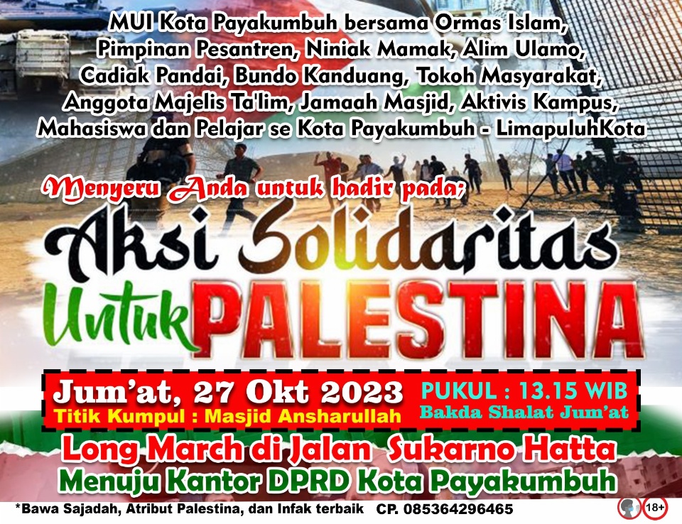 SEMANGATNEWS.COM — Sejumlah aksi bela Palestina diselenggarakan secara massal di seluruh belahan dunia. Untuk Warga Kota Payakumbuh, rencananya akan diselenggarakan aksi massa besar-besaran turun ke jalan pada hari Jum’at (27/10/2023) mendatang.